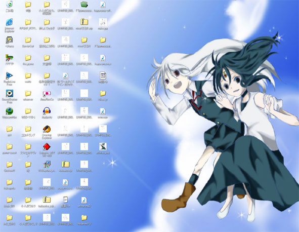 とりあえず楽だから(需要のない/小声)壁紙を先に全部作ってしまおうと思って一応自分の1280×1024パソモニタでてすてす。アイコン多いとか言っちゃDA☆ME!←