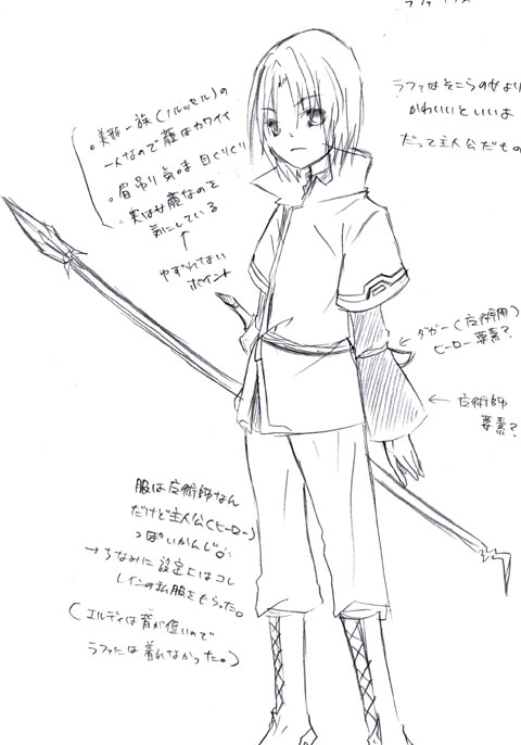 ただちょっと感情の起伏が薄いので笑っててもあんま笑ってるように見えないし怒っててもあんま怒ってるように見えない。ちなみにこの絵は微妙に微笑みです。基本的に皆さん笑顔で描いてますから。譲れないキャラ以外は…!(今描いた中ではラファ、エルディ、エッフェルリス、クルド、ギルビスがむっつり顔)